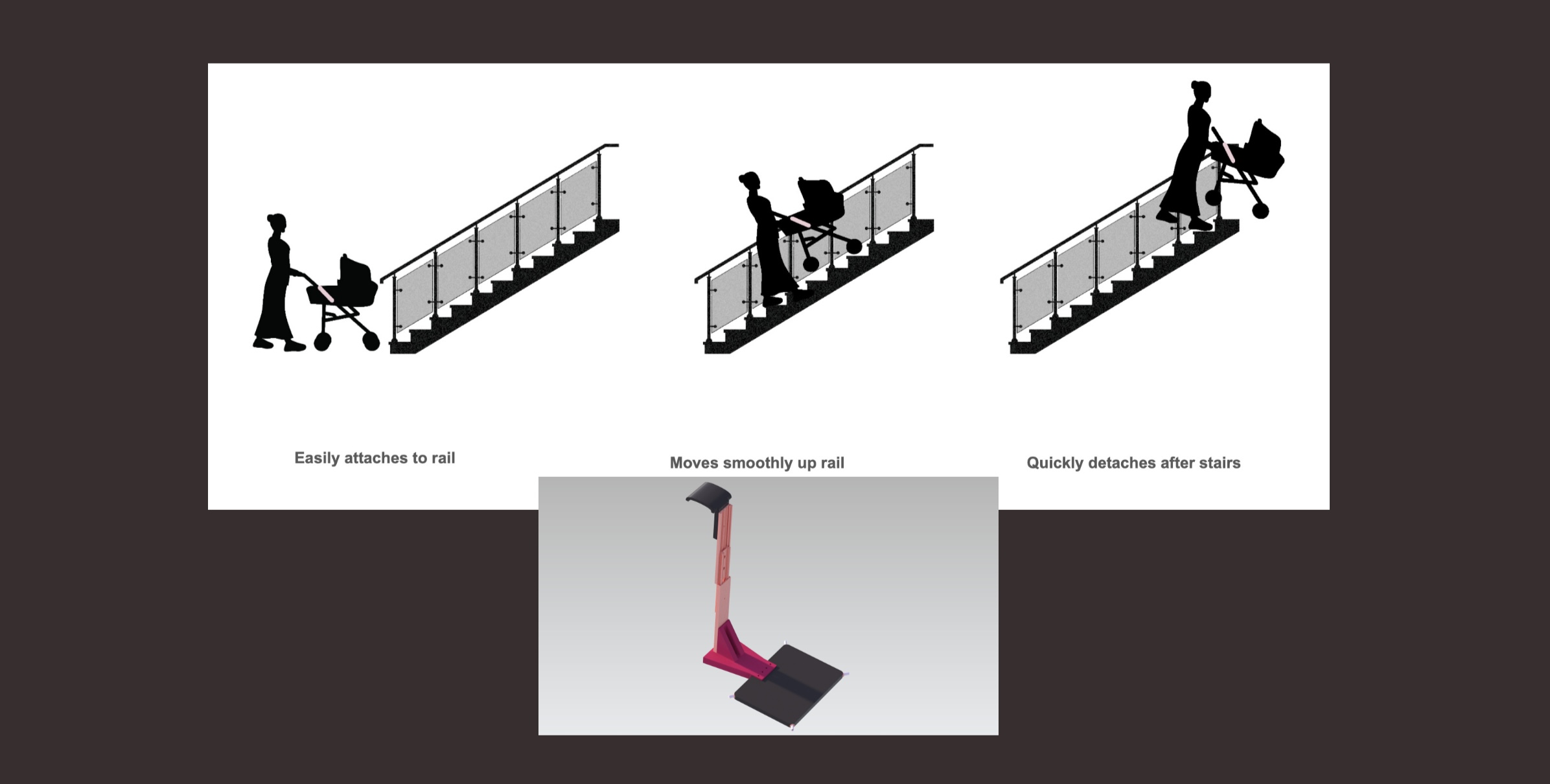 Only 33% of London Underground stations offer step-free access, creating significant mobility challenges for parents with strolleris a streamlined mechanical attachment designed to mount onto handrails, enabling mothers to safely and efficiently transport strollers over stairs. By enhancing physical capability, Lifty promotes greater accessibility and confidence in public transit environments.