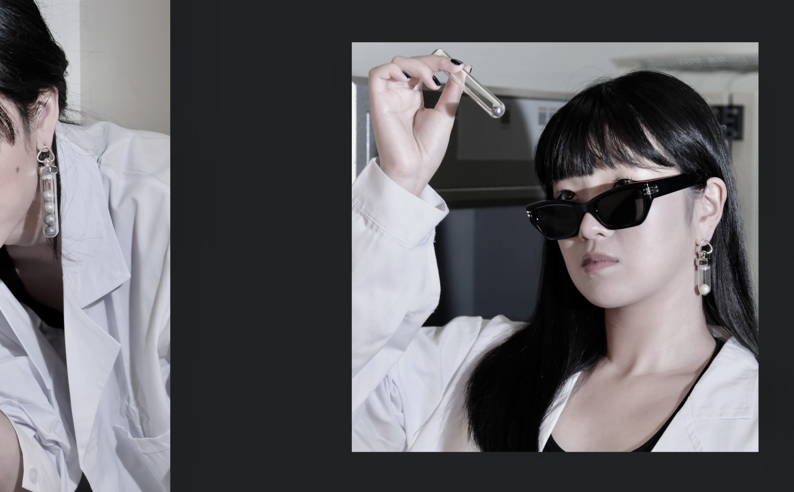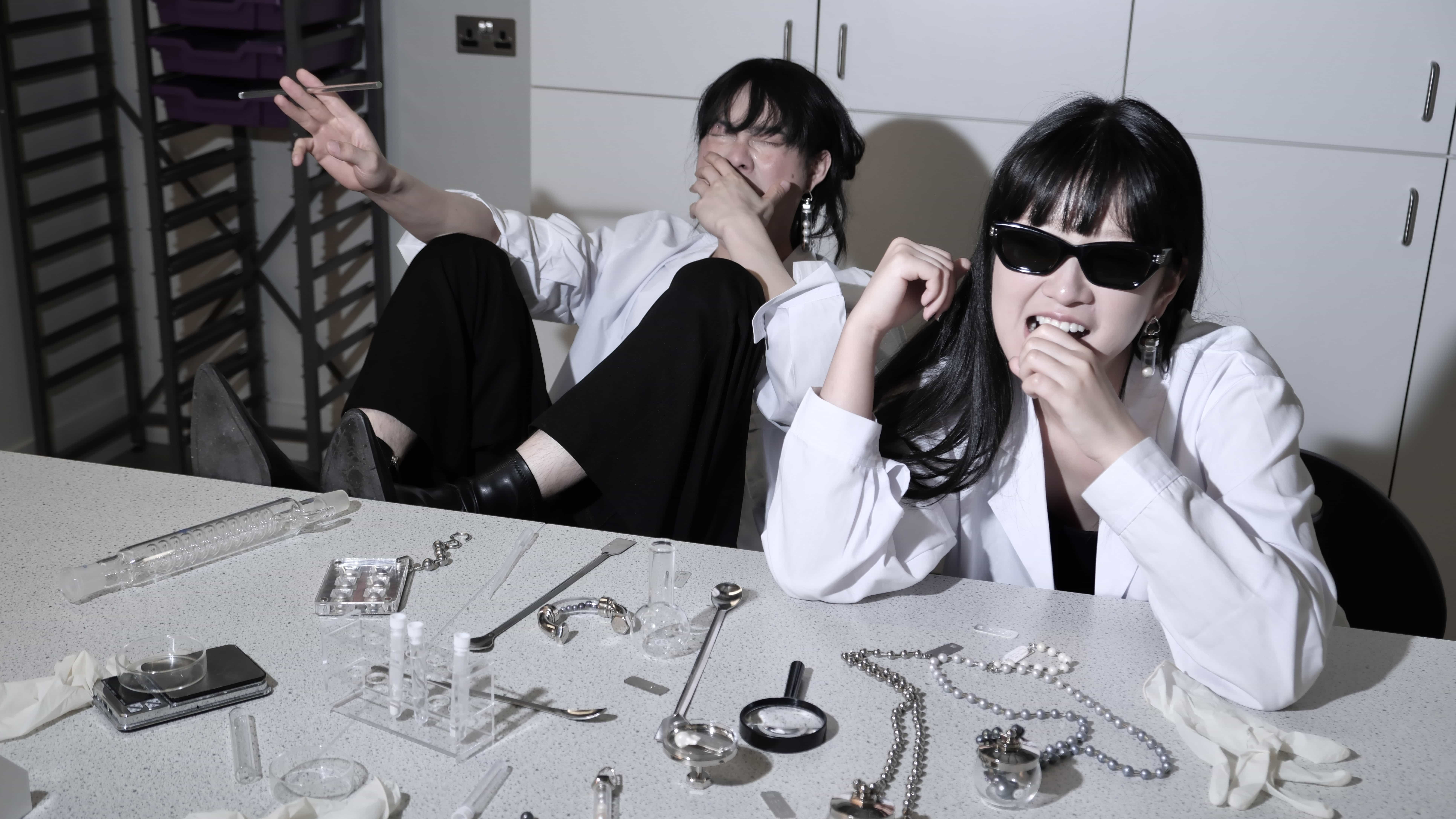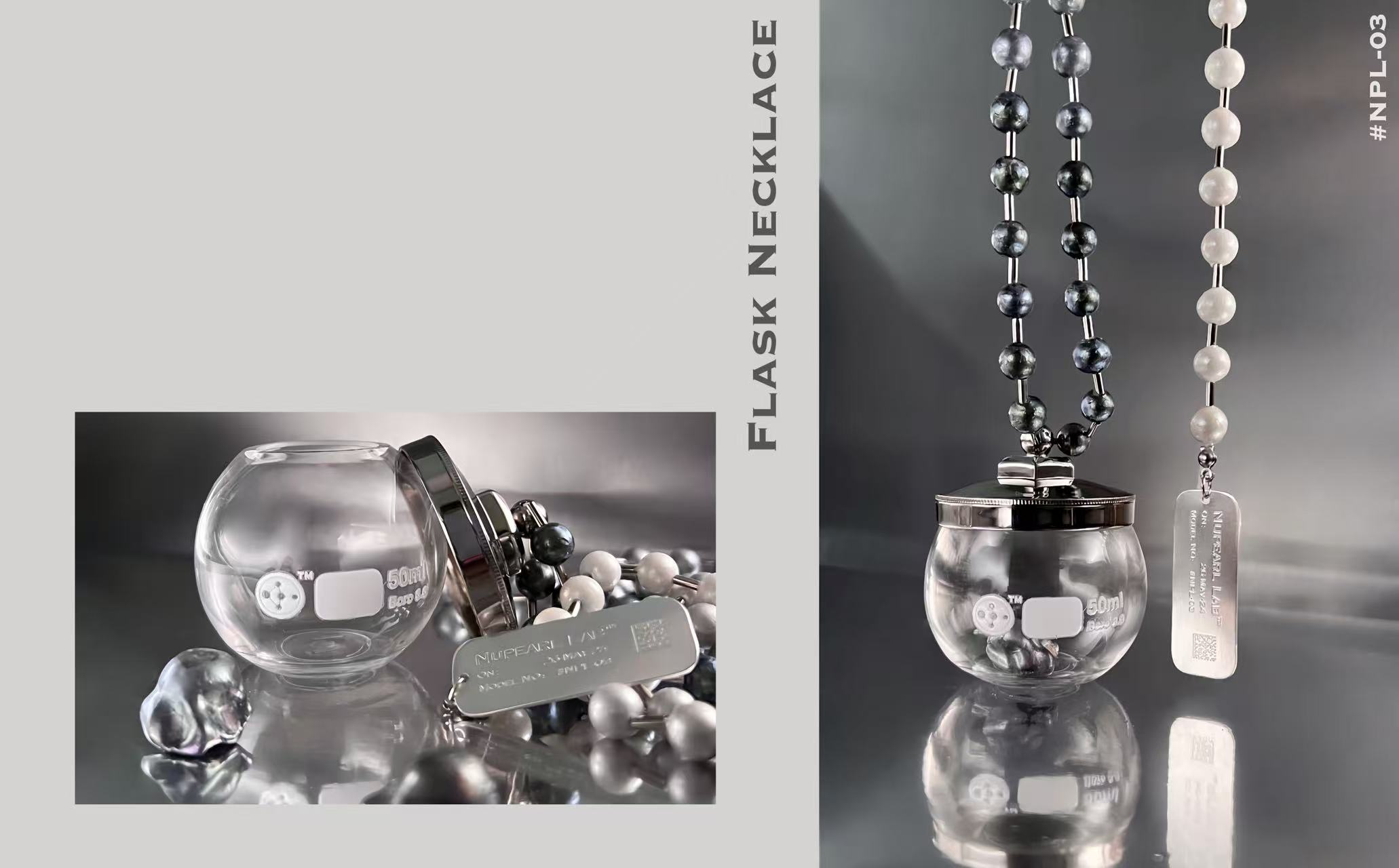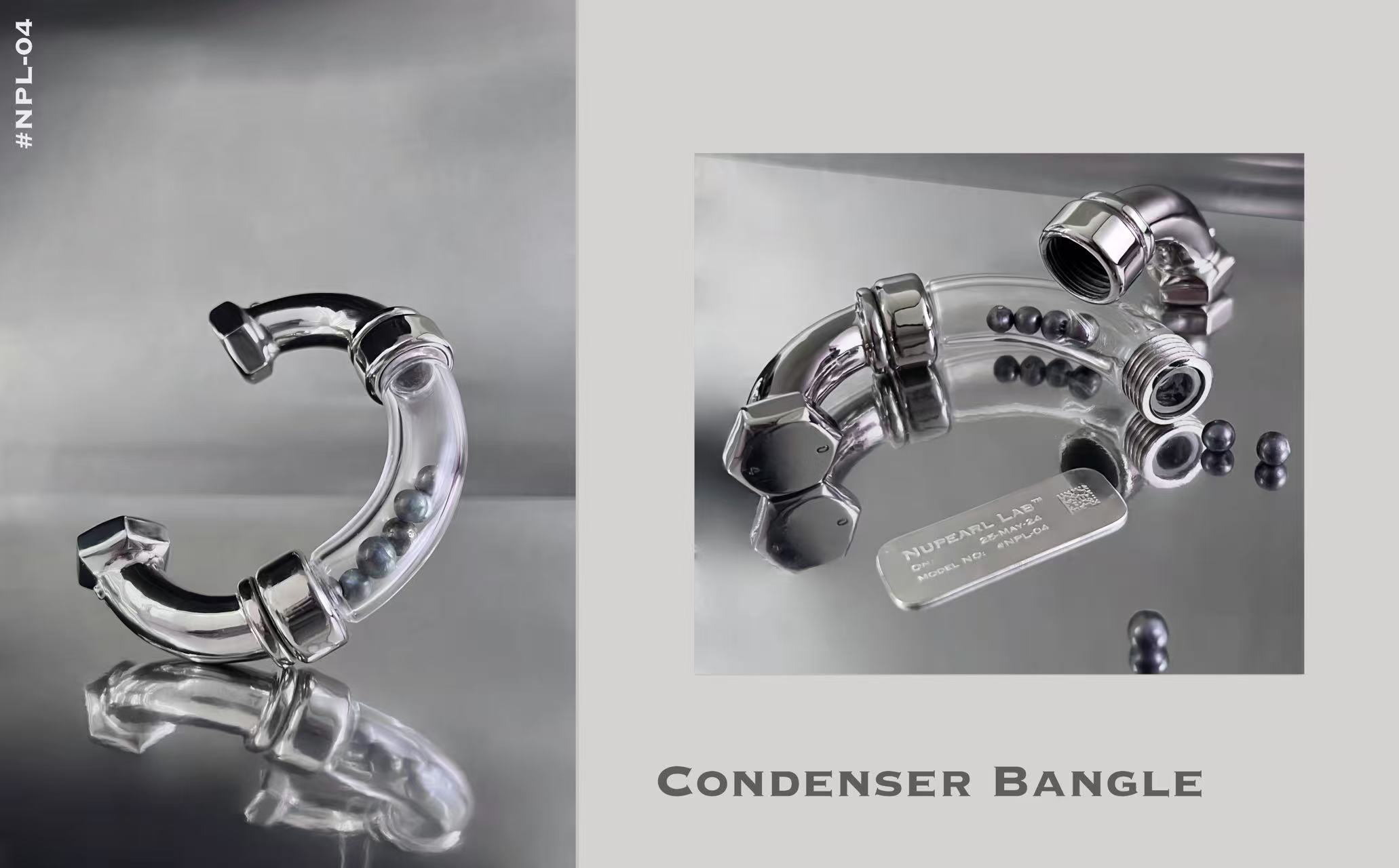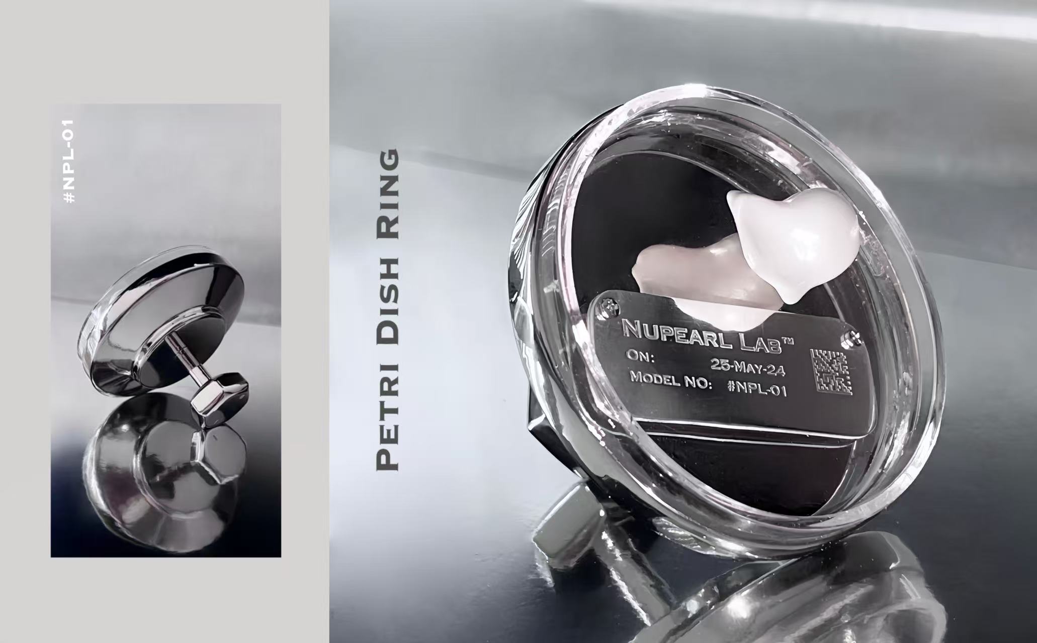 A collection of sleek and minimalist jewellery pieces blends industrial and laboratory aesthetics, symbolizing the origins of both limescale and Nupearls. The project conveys the vision of artificial vegan pearls, offering a sustainable alternative free from any involvement in animal ethics concerns.