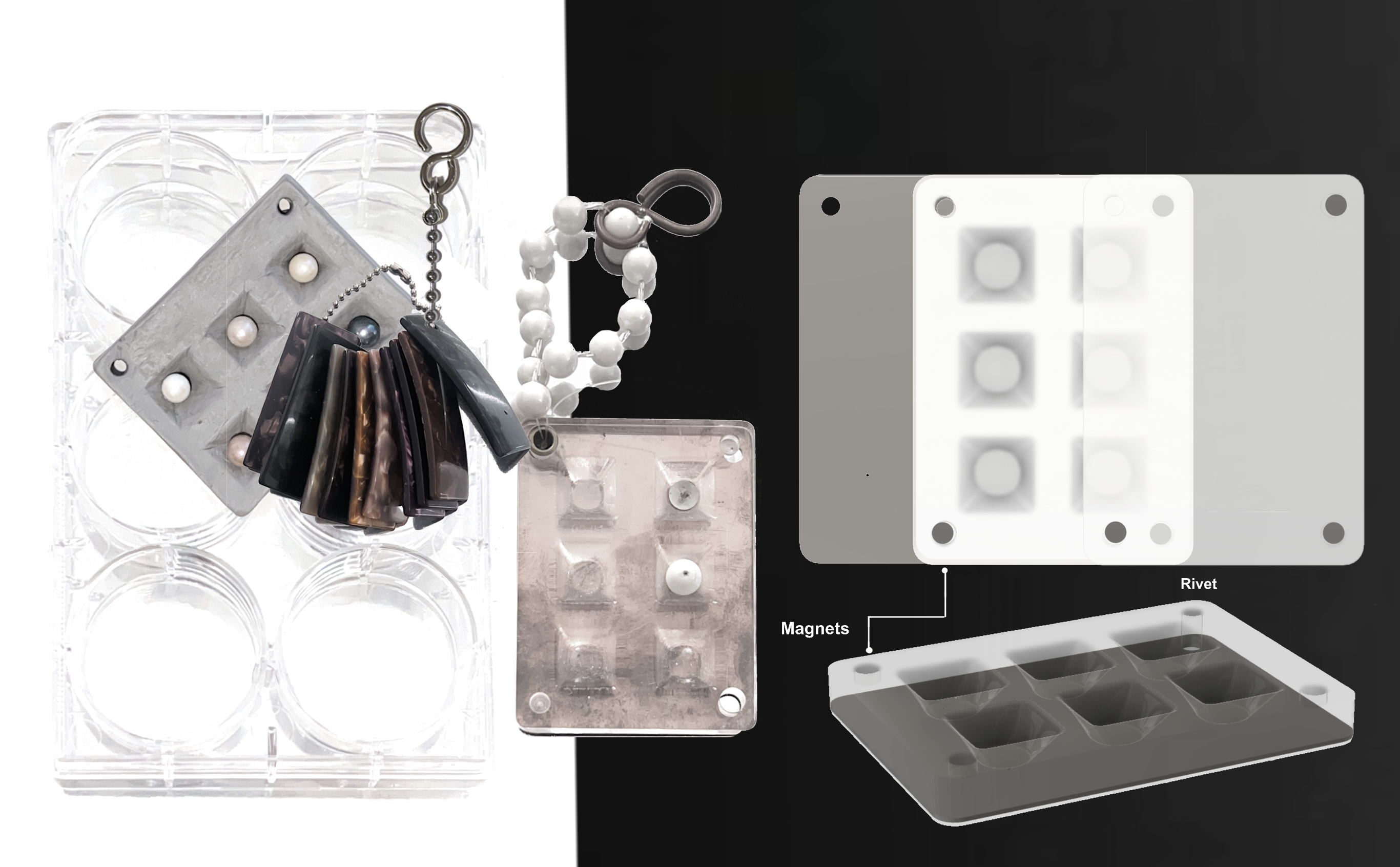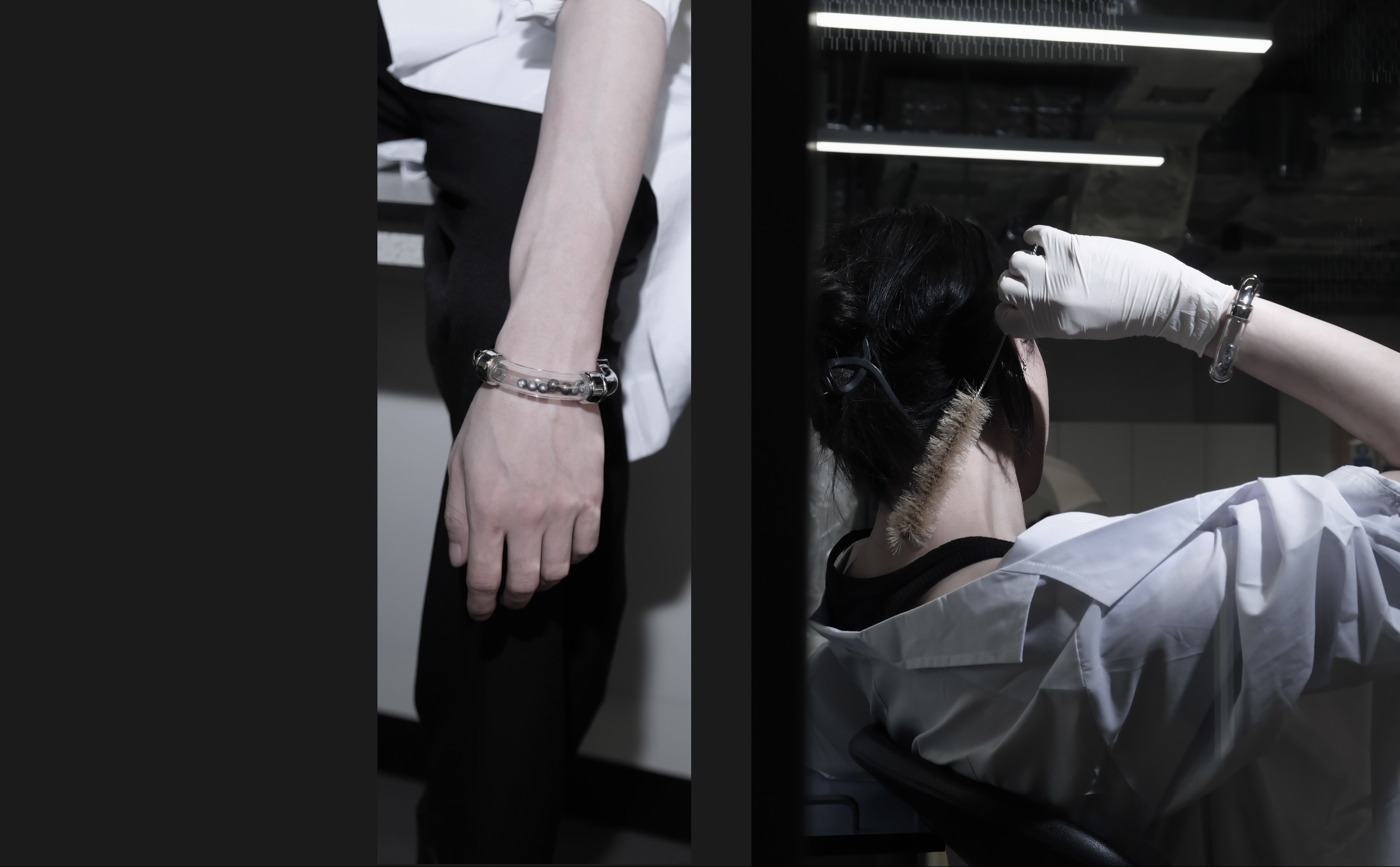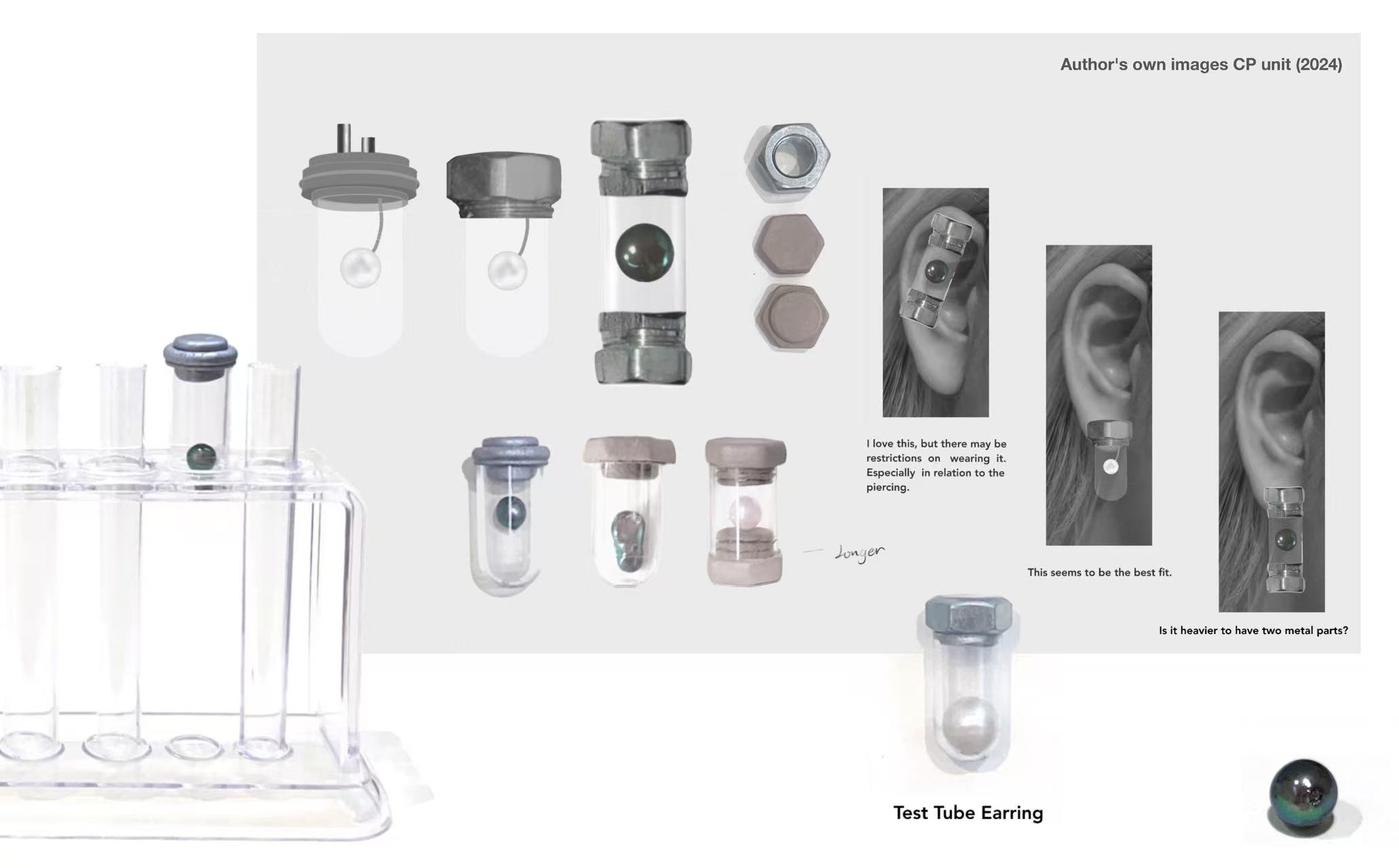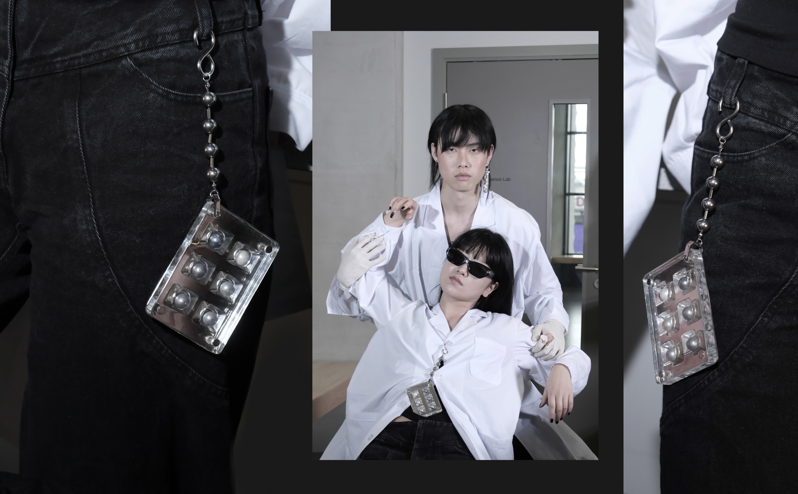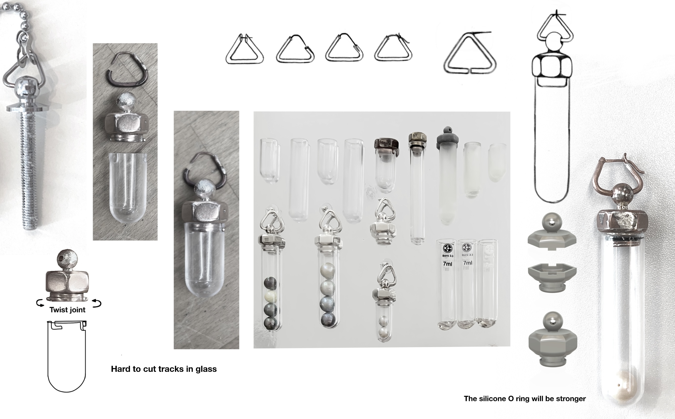 A collection of sleek and minimalist jewellery pieces blends industrial and laboratory aesthetics, symbolizing the origins of both limescale and Nupearls. The project conveys the vision of artificial vegan pearls, offering a sustainable alternative free from any involvement in animal ethics concerns.