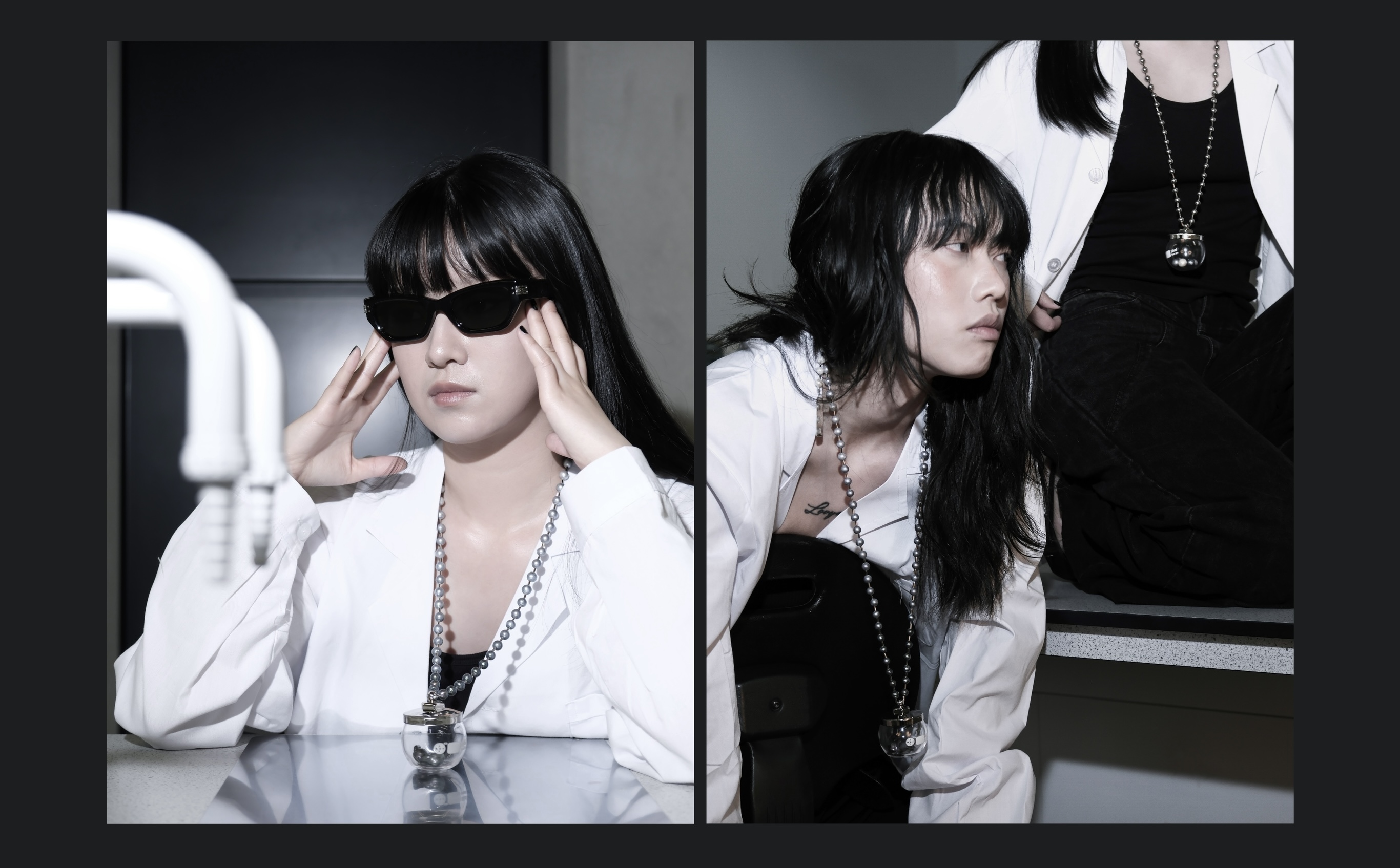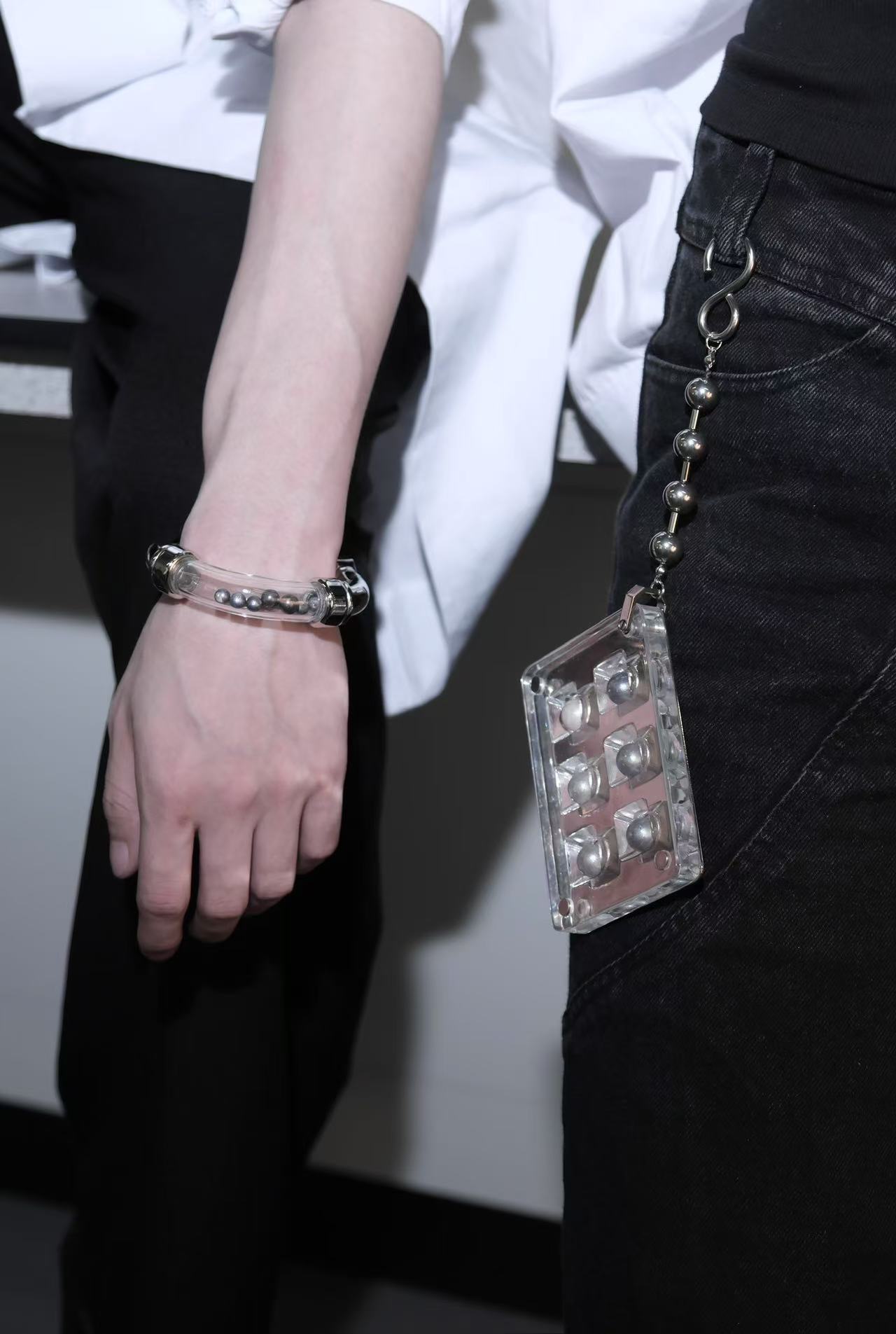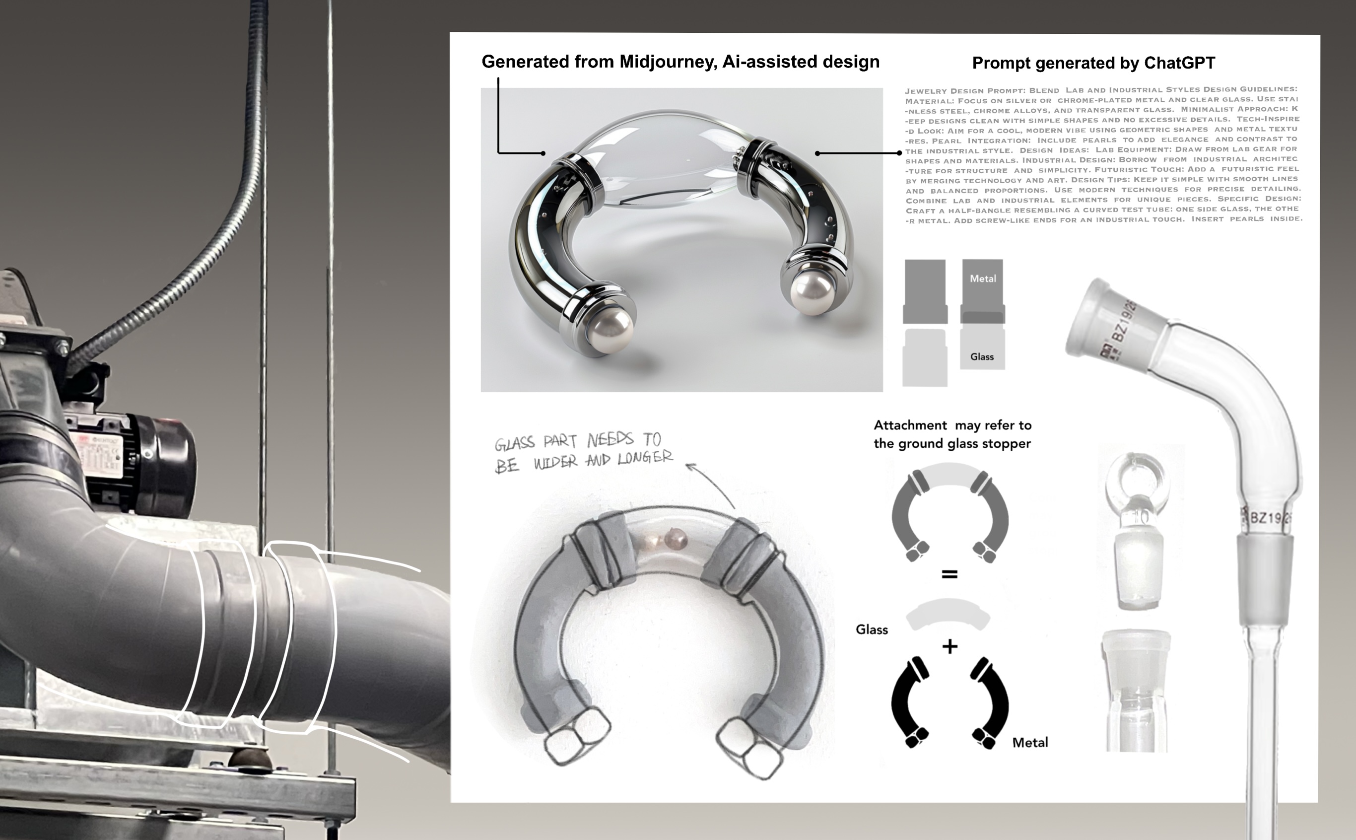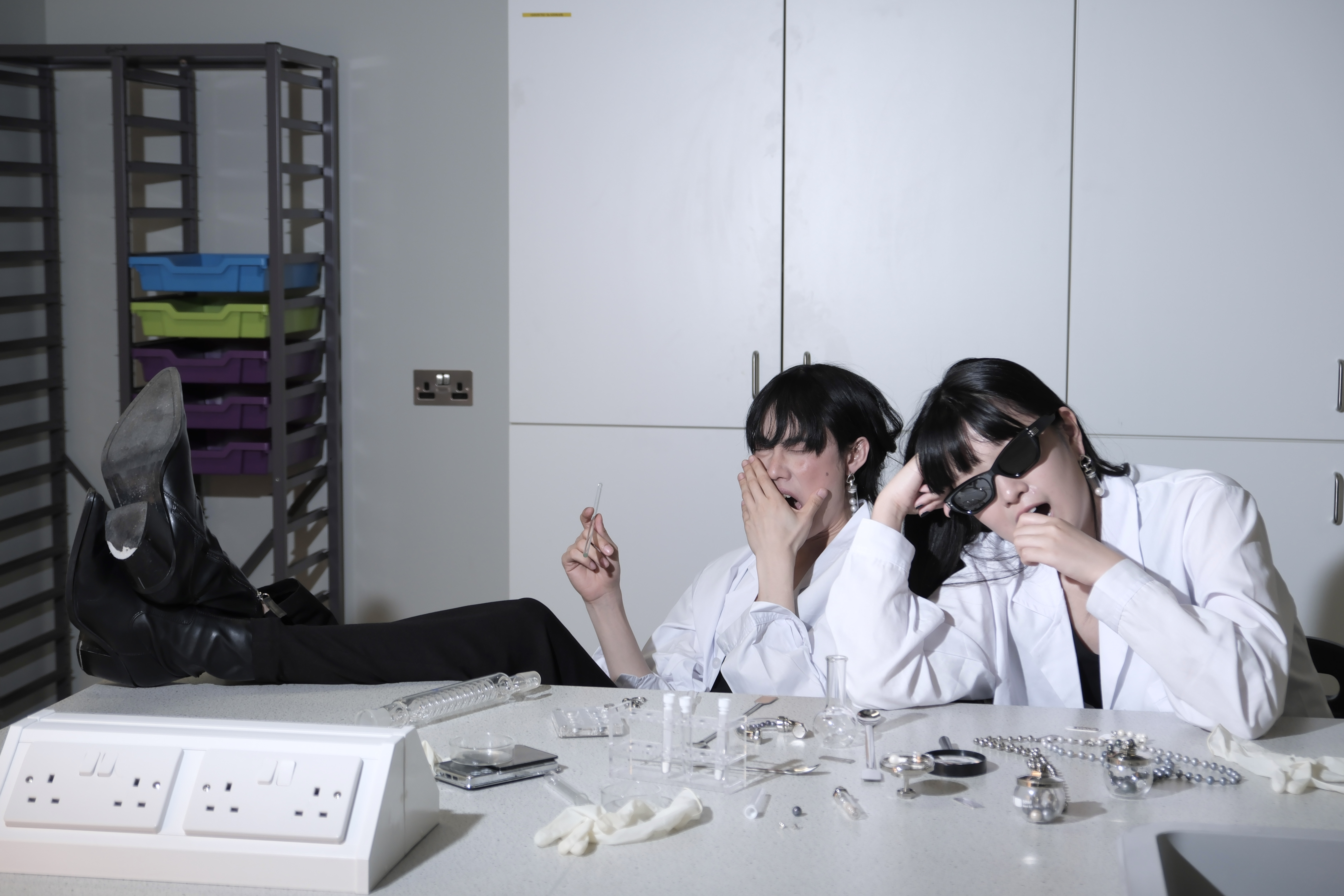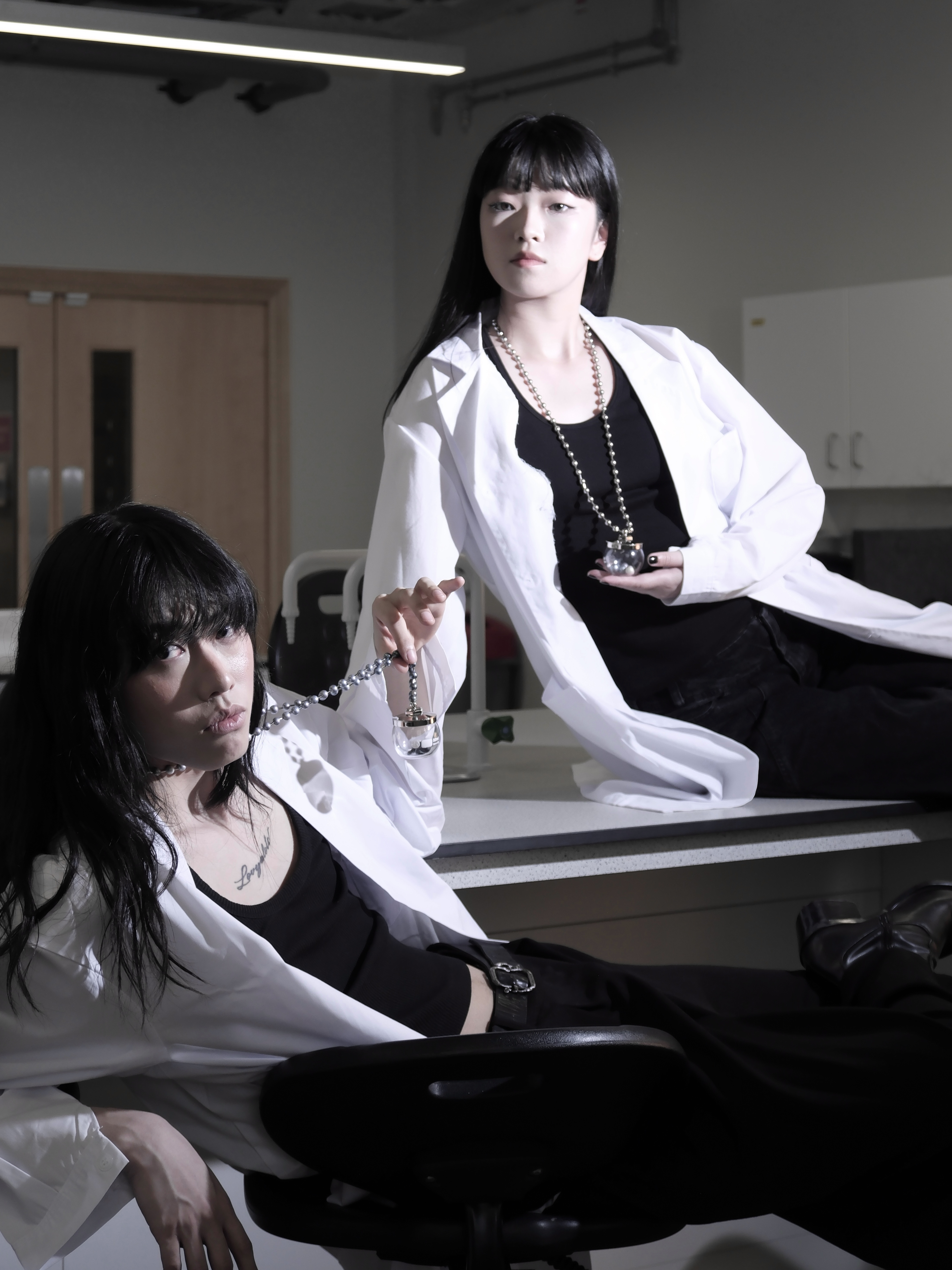 A collection of sleek and minimalist jewellery pieces blends industrial and laboratory aesthetics, symbolizing the origins of both limescale and Nupearls. The project conveys the vision of artificial vegan pearls, offering a sustainable alternative free from any involvement in animal ethics concerns.